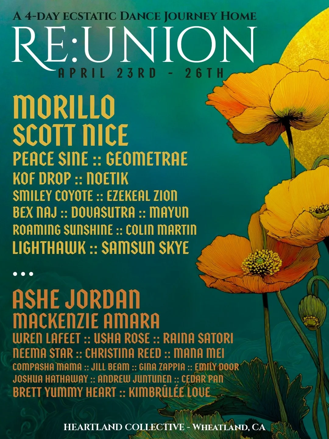 She is excited and grateful to share her guided offerings at Re:Union, which will be filled with eclectic downtempo beats, super-sweet releases, magic, and joy, all created from the heart to stir the senses and inspire dancers to ride a wave of expansion, community, purpose, and play.